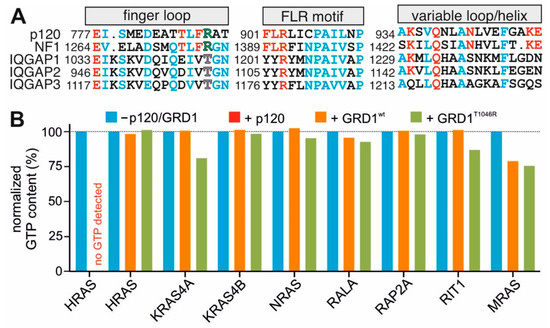 We set out to examine a possible GAP activity of IQGAP1 GRD towards different RAS family GTPases. Figure 5B shows that IQGAP1 GRD is a pseudo-RASGAP domain with no obvious catalytic ability (orange bars). Earlier studies have shown that the substitution of the arginine finger of the RASGAPs to other amino acids completely abolishes their GAP activity [67,68]. Therefore, threonine 1046 of IQGAP1 GRD was replaced by an arginine and the impact of T1046R on the GTP hydrolysis of the eight RAS proteins was measured. Data shown in Figure 5B revealed no apparent GAP activities of IQGAP1 GRDT1046R (green bars) as expected for a RASGAP. These data suggest that IQGAPs, besides lacking an arginine finger, do not contain critical RAS-binding residues of the a7/variable loop (Figure 5A).