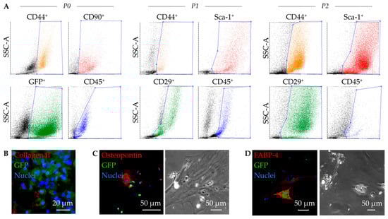 Functional characterization of murine mesenchymal stem cells (MSC). Representative dot plots of the flow cytometric analysis show GFP+ expressing cells (green, B6 eGFP mouse strain), as well as phenotypic alterations in expression of the MSC relevant surface markers over passages: CD44, CD90, CD45 at passage 0 (P0), as well as CD44, Sca-1, CD29, and CD45 at P1, and P2 (A). MSC demonstrate a multipotent differentiation potency proved by immunofluorescence staining and positive expression of collagen II after chondrocytic differentiation (B), osteopontin after osteocytic differentiation (C), and fatty acid binding protein 4 (FABP 4) after adipocytic differentiation (D). Phase contrast images illustrate morphological characteristics following respective differentiations: cytoskeletal structures for osteocytes (C) and lipid drops with visible vacuoles for adipocytes (D).