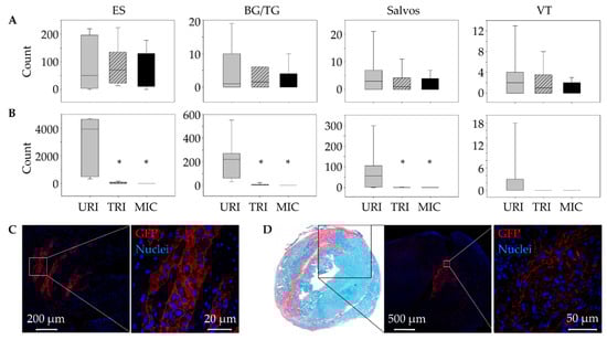 For transplantation of MSC, we used a mouse model, in which we re-induce ventricular arrhythmias one week after a first ischemia reperfusion by performing a second permanent ligation [16]. After the induction of the first infarction, a stem cell-treated animal and after the second infarction an untreated animal did not wake up again. As expected, no significant differences in arrhythmias were found between the groups after the first infarction (Figure 2A). In the time span up to 45 min following the second infarction also, no significant differences in arrhythmias were observed. From 45 min to 12 h, the URI group showed significantly more extrasystoles (ES), Salvos, and Bigemini (BG)/Trigemini (TG) compared to TRI. Ventricular tachycardias (VT) were not significantly increased (Figure 2B). However, VT only appeared in the URI group. Furthermore, arrhythmia reduction in TRI resulted in no significant differences compared to the MIC group.