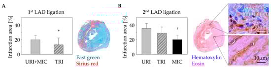 Change of myocardial infarct scar: Fast green/Sirius red staining of the murine heart cross sections 10 days after 1st LAD ligation showed a significant decrease of the infarction size in case of stem cell treatment (TRI) in contrast to untreated infarction (URI + MIC). Mean ± SD; * p = 0.05 (t-test); (A). Analysis of the leukocytes infiltration using Hematoxylin/Eosin staining 48 h after a 2nd LAD ligation in animals of URI and TRI group showed significant enlargement of the infarct scar area in contrast to infarction control (MIC) group. Mean ± SD; # p < 0.05 (t-test); (B).