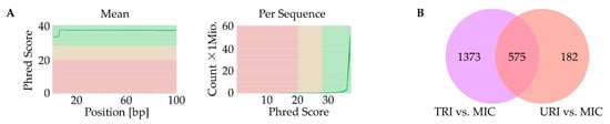 Identification of affected genes. Quality control with high Phred Score for all samples (green-good quality, yellow-mediocre quality, red-bad quality); (A); Venn-diagram with upregulated genes of TRI and URI compared to MIC as well as overlap of genes highly upregulated in TRI and URI (q ≤ 0.05); (B). URI, untreated re-infarction; TRI, stem cell treated re-infarction; MIC, MI control.