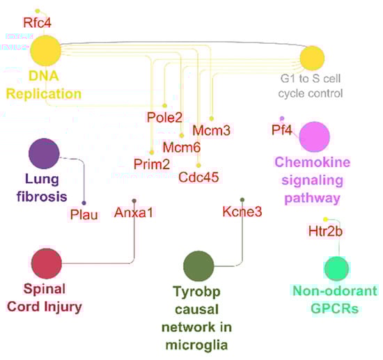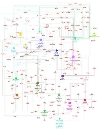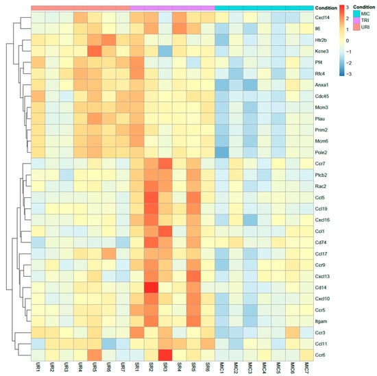 First, we compared the animal groups MIC vs. TRI, as well as MIC vs. URI. In this combination, nearly the same pathways with similar genes showed higher expression values. URI and TRI shared differences in pathways compared to MIC including Tyrobp casual network in microglia, type II interferon signaling, spinal cord injury, peptide GPCRs, microglia pathogen phagocytosis pathway, matrix metalloproteinase, macrophage markers, lung fibrosis, IL-5-signaling pathway, G1 to S cell cycle control, DNA replication, cytokines and inflammatory response, circulating monocytes and cardiac macrophage in diastolic dysfunction, chemokine signaling pathway and apoptosis. Besides common pathways, some genes are specific to one of the groups, while TRI showed more differently expressed genes then URI (Figure 4B).