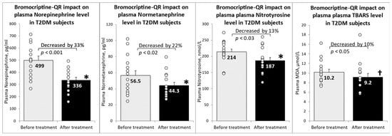 Following 4 months of timed (within 2 h of waking in the morning) daily bromocriptine-QR therapy, the fasting plasma levels of norepinephrine decreased by 33% (from 499 to 336 pg/mL, p < 0.001), and those of normetanephrine decreased by 22% (from 56.5 to 44.3 pg/mL, p < 0.02). Such treatment reduced the plasma systemic oxidative stress marker nitrotyrosine by 13% (from 214 to 187 nmol/L, p < 0.03) and its related downstream oxidative stress marker TBARS by 10% (from 10.2 to 9.2 μM/L MDA, p < 0.05 1-tailed) (Figure 1).