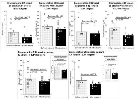 Furthermore, bromocriptine-QR therapy reduced the plasma levels of the pro-inflammatory factors MCP1 (by 13% from 284 to 246 pg/mL, p < 0.05), IL-1β (by 12% from 141 to 124 pg/mL, p < 0.04), prolactin (by 42% from 13.0 to 4.6 ng/mL, p < 0.02), IL-18 (by 21% from 343 to 270 pg/mL, p < 0.03), and CRP (by 45% from 5.2 to 2.9 mg/L). There was a non-significant trend toward a reduction in plasma IL-6 levels following bromocriptine-QR treatment (by 27% from 8.5 to 6.2 pg/mL, NS). However, among subjects with an elevated baseline lL-6 level (>6 pg/mL), the plasma IL-6 level decreased by 44% (from 11.1 to 6.2 pg/mL, p < 0.02) (Figure 2).