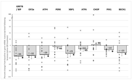 Effect (change from baseline) of 4 months of bromocriptine-QR treatment on PBMC ER stress-associated unfolded protein response gene mRNA level. * Significant, 2-tailed t-test; NS, Not Significant.