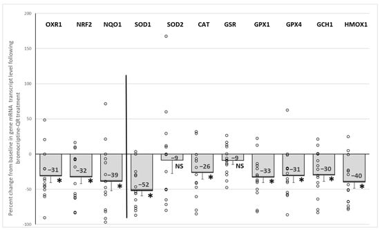 Effect (change from baseline) of 4 months of bromocriptine-QR treatment on the PBMC oxidative stress response (antioxidant) gene mRNA level. * Significant, 2-tailed t-test; NS, Not Significant.