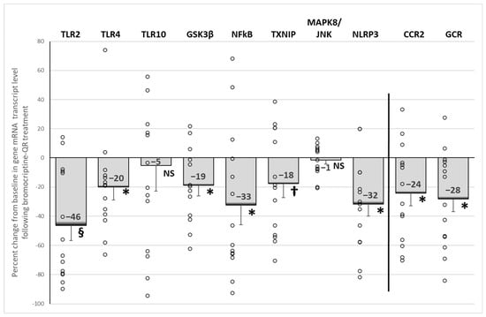 Bromocriptine-QR therapy reduced the mRNA expression of the damage-associated molecular pattern (DAMP)-activated pro-inflammatory pathway initiators TLR2 (by 46%, p < 0.001) and TLR4 (by 20%, p < 0.05), without an effect on TLR10 (5% decrease, NS). The treatment also reduced the mRNA expression of the TLR downstream pro-inflammatory gene signaling pathway proteins GSK3β (by 19%, p < 0.03), NFkB (by 33%, p < 0.03), TXNIP (by 18%, p < 0.05, 1-tailed), and NLRP3 (by 32%, p < 0.003), as well as the expression of the PBMC pro-inflammatory initiation receptors, CCR2 (by 24%, p < 0.02) and GCR (by 28%, p < 0.01) (Figure 5).