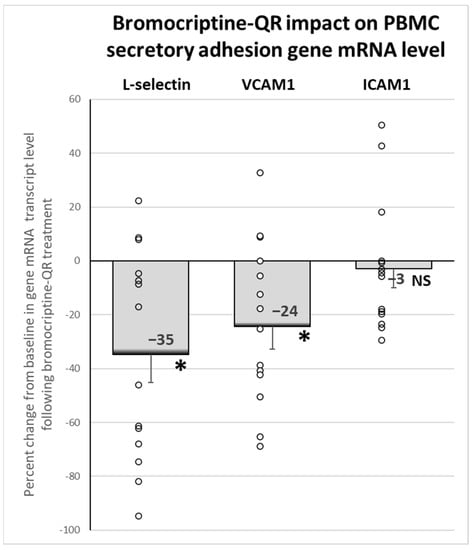 Bromocriptine-QR therapy reduced the mRNA expression of the secretory adhesion molecule genes: L-selectin (SELL, by 35%, p < 0.02) and vascular cell adhesion molecule 1 (vCAM, by 24%, p < 0.02), without an effect on intercellular adhesion molecule 1 (iCAM, 3% decrease, NS), Figure 6.