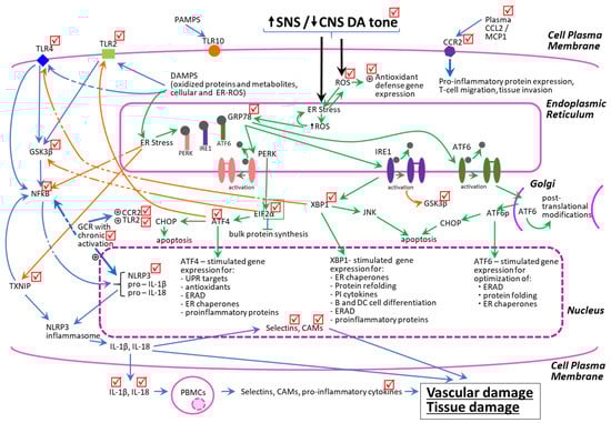 Although increased SNS and decreased dopaminergic tone can induce an immune and metabolic tissue PO/PI state that potentiates MS and CVD, it is also true that MS components (including hyperglycemia, insulin resistance, dyslipidemia, elevated plasma FFA levels, increased renin–angiotensin system activity, hypertension, elevated plasma thrombin, endothelin 1, and angiotensin 2 levels, and obesity) feedback to potentiate the PO/PI state within both immune and non-immune cell types. This reverberating circuit in turn can contribute to the onset and exacerbation of MS, T2D, and CVD [,,,,,,,,,,,,,,,,,,,,,]. Thus, a systemic chronic increase in the immune PO/PI state (initiated via an autonomic imbalance of elevated SNS tone and/or metabolic influences) fuels a whole-body shift in cardiometabolic status from health toward MS, T2D, and CVD, setting up a self-sustaining cycle of whole-body cardiometabolic pathology [,,,,,,,,,,,,,,]. Studies of MS subjects with and without T2D have provided evidence that the PO/PI state of PBMCs contributes to the development of MS and CVD [,,,,,,,,,]. Two major cellular dysfunctions that interact to contribute to an immunocyte (e.g., PBMCs) PO/PI state are endoplasmic reticulum (ER) stress and toll-like receptor (TLR) pro-inflammatory pathway overactivation.