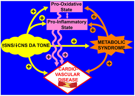 As described above, numerous clinical and preclinical studies have documented that a PBMC and systemic pro-oxidative/pro-inflammatory condition typifies the T2D state and contributes to the cardiometabolic pathology of the disease [,,,,,,,,,,,,,,,,,,,,,,,]. The chronic metabolic syndrome milieu of T2D, including glucolipotoxicity, insulin resistance, and dyslipidemia, in turn, feeds back to potentiate the immune system’s PO/PI state, and, as the cycle churns, it precipitates damage to organs and the cardiovascular system (endothelial dysfunction, arteriosclerosis, atherosclerosis, fibrosis, myocardial infarction, heart failure) [,,,,,,,,,,,,,,,,,,,,,]. An external engine that can drive the rate of this cycle is an altered autonomic regulation typified by a simultaneous elevation of sympathetic tone and a CNS hypodopaminergic state. As discussed above, the increased SNS/decreased CNS dopamine activity stimulates the PO/PI state [,,,,,,,,,,,,,,,,,,,,,,,,,,,,,,,,,,] and aggravates the MS milieu [,] increasing the PO/PI—MS—CVD cycle rate (see Figure 8).