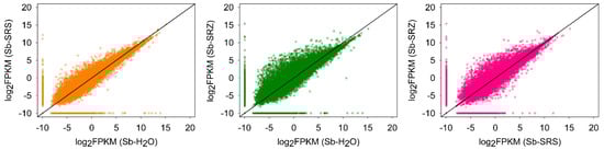 Comparison of FPKM of all sorghum genes at 3 days after inoculation. FPKM (fragments per kilobase of exon model per million mapped reads) values for transcripts detected in the comparison of Sb-SRS vs. Sb-H2O (left), Sb-SRZ vs. Sb-H2O (middle) or Sb-SRS vs. Sb-SRZ (right). A constant of 0.00001 was added to each FPKM to avoid zero scores in log calculations.