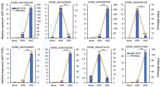 Validation of eight differentially regulated genes by qRT-PCR. Gene expression was measured by qRT-PCR after independent isolation of RNA of sorghum plants inoculated with water (mock), a combination of the mating compatible S. reilianum f. sp. zeae strains SRZ1_5-2 and SRZ2_5-1 (SRZ) or a combination of the mating compatible S. reilianum f. sp. reilianum strains SRS1_H2-8 and SRS2_H2-7 (SRS) relative to elongation factor 4 alpha (ElF4α; SORBI_3004G039400) and protein phosphatase 2 (PP2A; SORBI_3004G092500) and is given as relative normalized expression values (blue bars, left Y-axis). Error bars represent SEM of three independent biological replicates of three technical replicates each. Significance analysis was performed with a Student’s t-test relative to mock-inoculated samples, as indicated above by the error bars, and between SRS- and SRZ-infected samples, as indicated above by the respective bar graphs (n.s., non-significant; *, p < 0.05; **, p < 0.01; ***, p < 0.001). As comparison, the FPKM values of the RNAseq analysis are also indicated (orange line, right Y-axis).