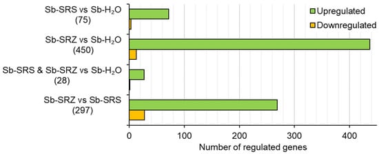 In the comparison of Sb-SRS vs. Sb-H2O, 75 genes were differentially regulated. Of these, 72 (96%) were upregulated and 3 (4%) were downregulated (Figure 3). A similar ratio was found for SRZ vs. control, however, about six times as many genes were differentially regulated: of the 450 genes with differential regulation, 437 (97%) were upregulated and 13 (3%) downregulated (Figure 3). In total, 28 sorghum genes that were differentially regulated by inoculation with SRS were also regulated by inoculation with SRZ (Figure 3, Sb-SRS and Sb-SRZ vs. Sb-H2O). Of these 28 genes, 27 (96%) were upregulated and 1 (4%) downregulated in both samples relative to the mock-inoculated sorghum. No gene was upregulated in one sample and downregulated in the other.