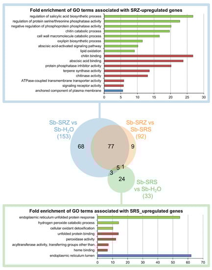 We analyzed the significantly regulated genes of the three conditions using the Gene Ontology Resource online. In the comparison of Sb-SRZ vs. Sb-H2O, more GO terms were significantly enriched among the upregulated genes than in any other comparison, whereas the comparison of Sb-SRS vs. Sb-H2O had the fewest significantly enriched GO terms (Figure 4). Most (68) GO terms appeared either in the comparison of Sb-SRZ vs. Sb-H2O or (77) appeared both in the comparison of Sb-SRZ vs. Sb-H2O and Sb-SRZ vs. Sb-SRS. This group of GO terms describes the function of genes that are more induced in sorghum by SRZ than by SRS. The most significant GO terms of this group in the biological process category were the “regulation of salicylic acid biosynthetic process”, “regulation of protein serine/threonine phosphatase activity”, “negative regulation of phosphoprotein phosphatase activity”, “chitin catabolic process”, “cell wall macromolecule catabolic process”, “oxylipin biosynthetic process”, “abscisic acid-activated signaling pathway” and “lipid oxidation”. In the molecular function category were terms that included “chitin binding”, “abscisic acid binding”, “protein phosphatase inhibitor activity”, “terpene synthase activity”, “chitinase activity”, “ATPase-coupled transmembrane transporter activity” and “signaling receptor activity”, whereas in the cellular component category the term “anchored component of plasma membrane” was the most prominent (Figure 4).