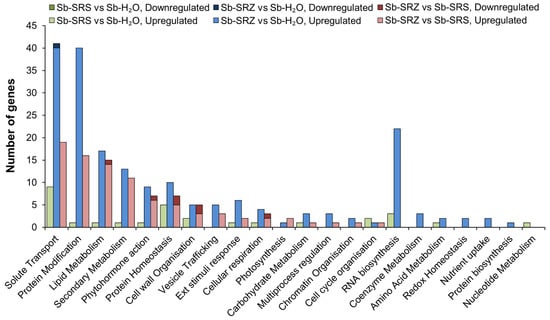Bar chart showing number of differentially expressed sorghum genes classified in categories according to MapMan. Up- and downregulated genes of each comparison are presented in the same bar on top of each other. None of the downregulated genes of the comparison of Sb-SRS vs. Sb-H2O were assigned to any category.