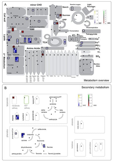 MapMan visualization of differentially expressed genes of Sorghum bicolor at 3 days after inoculation with S. reilianum f. sp. reilianum (SRS) or S. reilianum f. sp. zeae (SRZ). An overview of the metabolism is shown in (A), while (B) focuses on the genes involved in secondary metabolism. Significantly regulated genes are represented by squares whose color indicates the degree of regulation. In the comparison of Sb-SRS vs. Sb-H2O, the green–black–red color gradient indicates downregulated–not-regulated–upregulated genes, while in the comparison of Sb-SRZ vs. Sb-H2O, the used color gradient is yellow–white–blue. Dots indicate that the respective genes were not among the detected significantly regulated genes.