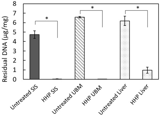 The efficiency of decellularization was evaluated using hematoxylin and eosin (HE) staining (Figure 1) and the amount of residual DNA (Figure 2). Figure 1B,D,F show the absence of purple-stained nuclear remnants in HHP-decellularized tissues. The amount of double-stranded DNA (dsDNA) remaining in the HHP-decellularized tissues was significantly reduced compared to that in untreated tissues (Figure 2). Because of the thickness of the liver compared to SIS and UBM, the cell nuclei deep inside the liver tissue could not be removed during the decellularization process adopted in this study.