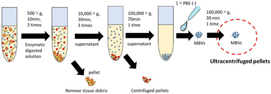 The pepsin-digested solutions were centrifuged at 500× g (10 min) and 10,000× g (30 min). Each centrifugation step was performed three times at 4 °C. The collected supernatant was ultracentrifuged at 100,000× g using a Beckman Coulter Optima L-90K ultracentrifuge machine (Beckman Coulter, Inc., Brea, CA, USA) at 4 °C for 70 min. The ultracentrifuged pellets were then washed with 1× PBS (−) and ultracentrifuged again (100,000× g) for 30 min. The pellets were resuspended in 500 µL of 1 × PBS (−) and passed through a 0.22 µm filter (Merck Millipore, Darmstadt, Germany). The isolated MBVs were stored at −20 °C until use.