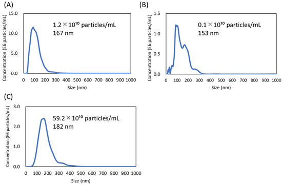 The size and concentration of MBVs within the ultracentrifuged pellets were determined using a NanoSight LM10 (Malvern Panalytical, Worcestershire, UK). This enables the analysis of both nanoparticle size and concentration by visualizing the Brownian motion of nanoparticles in a solvent using NTA. Samples were diluted with 0.1 µm-filtered Milli-Q water or PBS (−) to prepare 500 µL of the sample diluent. Brownian motion images were captured five times, each for 60 s, with the camera level set to 13. The particle size and concentration were calculated from an analysis of the images. The average size and concentration of the MBVs were quantified.