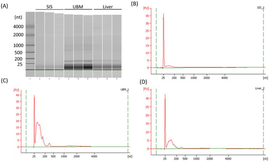 Bioanalyzer gel image (A) and electropherograms of total RNA isolated from MBVs derived from HHP-decellularized SIS (B), UBM (C), and liver (D).