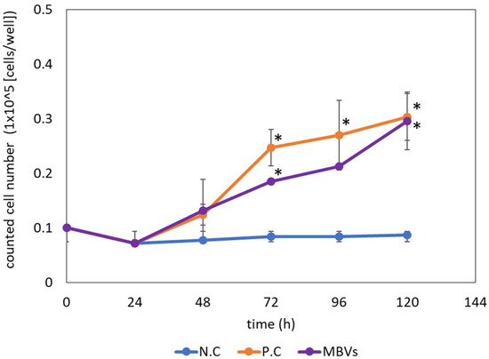 Growth curve of HH cells exposed to isolated MBVs derived from HHP-decellularized SIS. * p < 0.05.