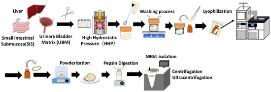 Figure 9 describes the preparation process for the isolation of MBVs. The porcine small intestine, urinary bladder, and liver were rinsed with saline, and the tissues surrounding the fat were removed. To prepare small intestinal submucosa (SIS), the tunica mucosa, tunica serosa, and tunica muscularis externa were mechanically removed. The urinary bladder matrix (UBM) was prepared by mechanically removing the serosal and muscular layers. The liver was cut into cubes with 1 cm-long sides. The trimmed SIS, UBM, and liver were placed in plastic bags filled with saline and pressurized at 1000 MPa and 30 °C for 10 min using a hydrostatic pressurization system (Dr. Chef, Kobelco, Tokyo, Japan). After HHP treatment, tissues were immersed in DNase (0.2 mg/mL) and MgCl2 (50 mM) in saline at 4 °C for seven days, followed by washing with 80% ethanol in saline at 4 °C for three days, and with saline at 4 °C for an additional three days.