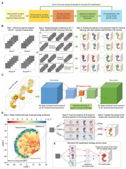 Algorithmic framework of AlphaCryo4D for 4D cryo-EM reconstruction. (A) Schematic showing the major conceptual steps of single-particle cryo-EM data processing in AlphaCryo4D. (B) Schematic showing the method of M-fold particle shuffling for resampling of 3D volumes. In step 1, all particles are split randomly into M + 1 groups equally. Then step 2 carries out the Bayesian clustering for reconstructions of 3D density maps within each of the M + 1 particle sets that are shuffled via the ‘removing-one-group’ approach. After these two steps, thousands of 3D volumes are generated for the subsequent 3D deep learning, with each particle contributing to M volumes. (C) Schematic of unsupervised deep residual learning of 3D feature maps by a six-block autoencoder conjugated to a five-block decoder. (D) Schematic showing the algorithmic concept of energy-based particle voting for 3D classification of improved accuracy. The left panel shows the pseudo-energy landscape obtained by deep manifold learning. After clustering along the minimum energy path, all M locations of each particle on the pseudo-energy landscape can be tracked to cast M votes. A vote of the particle is only counted for the cluster when it is mapped within the voting boundary of the cluster, as indicated by the circles marked on the pseudo-energy landscape. Eventually, this particle is classified in the 3D cluster with at least M/2 votes for this particle. (E) Alternative distance-based 3D classification method. This serves as a control in the analysis of the algorithmic performance. Instead of particle voting, each particle is directly classified to the cluster with the nearest clustering center among the M volume data points in the distance-based 3D classification strategy.