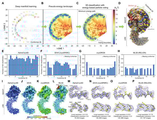 Performance evaluation of AlphaCryo4D for reconstruction of the conformational continuum at the atomic level. (A) Manifold learning of 3D volumes of the simulated NLRP3 dataset with SNR of 0.01 by the 3D autoencoder. Each data point corresponds to a 3D volume. The color labels the conformer identity of ground truth for the purpose of verification. (B) Pseudo-energy landscape computed from the manifold embedding shown in (A). (C) Minimum energy path (orange line) calculated by the string method is used to find the approximate cluster centers of 20 conformers. The cluster boundaries for energy-based particle voting are shown as dashed circles. (D) The 20 reconstructions resulting from AlphaCryo4D using a simulated dataset with SNR of 0.01 are superimposed together, shown in surface representation, and aligned against its LRR domain. (E–H) Plots of 3D classification precisions of the 20 NLRP3 conformers from blind assessments on the simulated NLRP3 dataset with SNR of 0.01, using AlphaCyo4D (E), 3DVA in cryoSPARC (F) [], cryoDRGN (G) [], and ML3D in RELION (H) []. All 3D conformers in panel (E) were reconstructed to 2.6–2.9 Å resolution (Supplementary Figure S2D). Asterisks mark the missing conformers that were completely lost due to misclassification. Black arrows highlight Conformer 6. (I–L) Typical side-by-side comparison of density map quality and local resolution of the same conformer (ID 6) reconstructed by AlphaCryo4D (I), 3DVA (J), cryoDRGN (K) and ML3D (L). The maps are colored by their local resolutions calculated by Bsoft blocres program. (M–P) Closeup side-by-side comparison of the same two secondary structures, including a loop (upper row) and a helix (lower row), in the NACHT domain illustrates considerable improvements in local density quality and resolution by AlphaCryo4D (M) as opposed to 3DVA (N), cryoDRGN (O) and ML3D (P). The locations of the loop and helix in the NLRP3 structure are marked by dashed boxes in panel (L). The same ground-truth atomic model of Conformer 6 shown in stick representations is superimposed with the density maps shown in blue mesh representations, all from the same perspective. The atomic model was not further refined against each map for visual validation of the map accuracy.