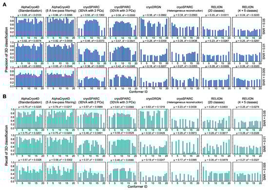 By increasing the preset class number to 25 or 30 which is more than the number of ground-truth conformers, all tested methods appear to be improved in the precision of 3D classification marginally but also reduced in the recall of classification (defined as the percentage of correctly assigned particles versus the number of ground-truth particles for a conformer) (Supplementary Figure S4). In these cases, AlphaCryo4D still outperformed all alternative methods considerably, with the highest average classification precision reaching 0.91 at the SNR of 0.05.