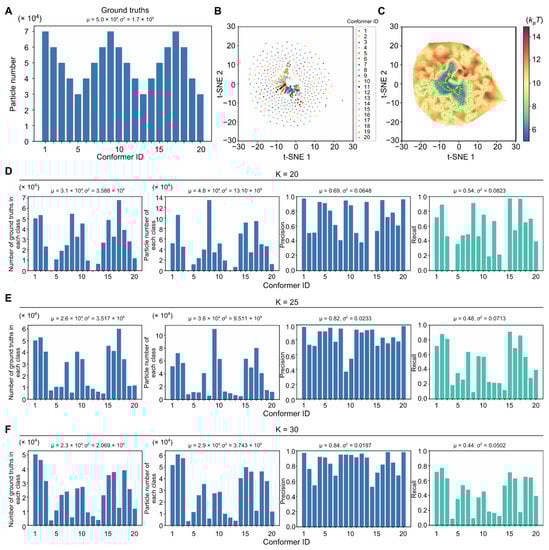 Performance evaluation of 3D classification by AlphaCryo4D on the synthetic dataset with non-uniform distribution of conformational continuum. (A) The non-uniform distribution of 20 conformers of another simulated NLRP3 dataset at an SNR of 0.01 was used to examine the performance of AlphaCryo4D. This dataset was utilized to calculate the pseudo-energy landscape shown in panels (B,C) and its corresponding outcome of 3D classification by AlphaCryo4D shown in panels (D–F), which tests the robustness of AlphaCryo4D in the case of non-uniform distributions of the underlying conformational states. (B) Dimensionality reduction of resampled 3D volumes and their corresponding feature maps from the simulated dataset by t-SNE. The colors of data points indicate the ground truth of their corresponding 3D volumes. (C) Reconstruction of the pseudo-energy landscape of the simulated NLRP3 dataset. (D–F) The number of correctly classified particles in each class, the particle number of each class, the precision of 3D classification and the corresponding recall of AlphaCryo4D blind tests using this simulated dataset when the class number is set to 20 (D), 25 (E) and 30 (F).