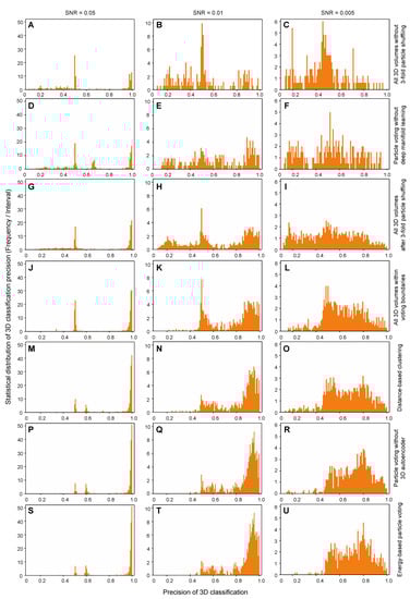 Mechanistic characterizations of the improvement of 3D classification accuracy by AlphaCryo4D using the simulated NLRP3 datasets of three typical SNRs. Left, middle and right vertical columns show the precision analysis on the simulated datasets with SNRs of 0.05, 0.01 and 0.005, respectively. In total, there are 21 conditional controls under six different algorithmic design variations being analyzed in panels (A–R). (A–C) Statistical distribution of 3D classification precision in resampled 3D volumes without particle shuffling. (D–F) Statistical distribution of 3D classification precision by implementing particle voting directly on the resampled 3D volumes without using deep manifold learning. The procedure of 3-fold particle shuffling and volume resampling is identical to AlphaCryo4D. (G–I) Distribution of 3D classification precision in resampled 3D volumes after 3-fold particle shuffling in the intermediate step of AlphaCryo4D. (J–L) Distribution of 3D classification precision in all resampled 3D volumes within voting boundaries on the pseudo-energy landscape in the intermediate step of AlphaCryo4D. (M–O) Distribution of 3D classification precision after distance-based 3D clustering in the absence of energy-based particle voting with all prior steps identical to AlphaCryo4D. (P–R) Distribution of 3D classification precision after particle voting by a modified AlphaCryo4D variation only without using deep residual autoencoder in the manifold embedding step. (S–U) Distribution of 3D classification precision after energy-based particle voting via a complete AlphaCryo4D procedure.