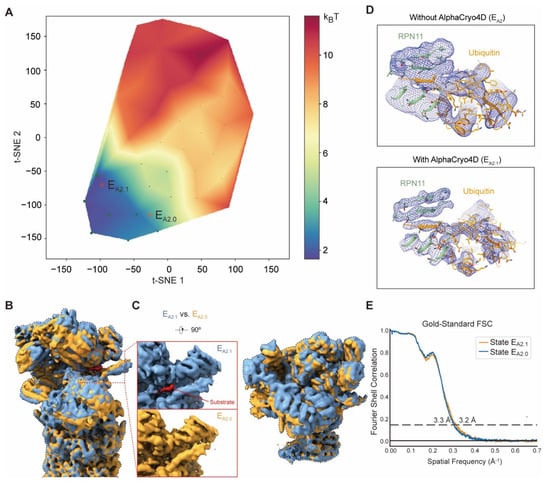 To demonstrate that AlphaCryo4D can simultaneously improve 3D classification and resolution of key dynamic features, we examine a representative case among numerous improvements of solving the proteasome dynamics by AlphaCryo4D []. Here, we focus on state EA2 of the substrate-engaged 26S proteasome, which is the initial state that a substrate-conjugated ubiquitin moiety that binds the deubiquitylating enzyme RPN11 to prepare for substrate engagement and deubiquitylation. In this case, we expected to use AlphaCryo4D to detect if an intermediate substrate binding to RPN11 precedes the deubiquitylation step of the proteasome [].