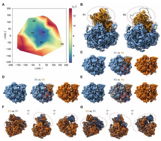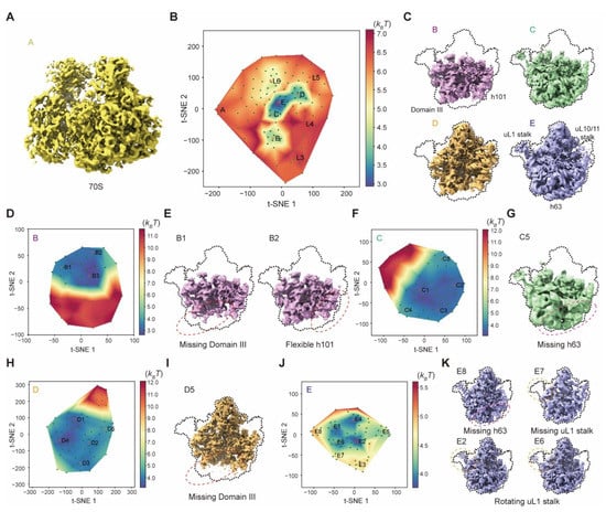In the last application, we used AlphaCryo4D to analyze a highly heterogeneous dataset of the Escherichia coli 50S large ribosomal subunit (LSU) (EMPIAR-10076) []. This dataset (131,899 particles) is known to be both compositionally heterogeneous and conformationally dynamic in that the 50S LSU undergoes bL17-depleted intermediate assembly. We first computed the overall pseudo-energy landscape of the ribosomal assembly using 119 density maps (Figure 9B). On this pseudo-energy landscape, the originally reported five major states A–E were straightforwardly reproduced by energy-based particle voting (Figure 9A–C). Obviously, state A containing both 50S and 30S subcomplexes is a rare state distinct from other conformers (Figure 9A). The density map of state A reconstructed by only 766 particles still retains enough details, benefiting from the strategy of energy-based particle voting.