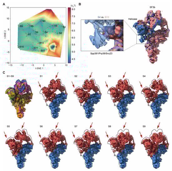 We next evaluated the applicability of AlphaCryo4D in simultaneously visualizing continuous motion and discrete compositional heterogeneity in the yeast Saccharomyces cerevisiae pre-catalytic spliceosome (EMPIAR-10180) []. A previous study using focused classification has provided a multistate-averaged map of the pre-catalytic B complex spliceosome and speculated that the SF3b subcomplex might sample a continuum of conformations []. To characterize the pre-catalytic spliceosome dynamics, we resampled 160 density maps using 327,490 particles to reconstitute its pseudo-energy landscape (Figure 8A), which allowed us to determine many intermediate states (S1–S9) representative of a continuous motion of the SF3b and helicase subcomplexes as well as several compositionally distinct states (S10–S14).