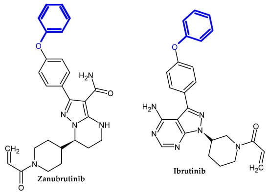 - Wu, J.; Liu, C.; Tsui, S.T.; Liu, D. Second-Generation Inhibitors of Bruton Tyrosine Kinase. J. Hematol. Oncol. 2016, 9, 80. [Google Scholar] [CrossRef]