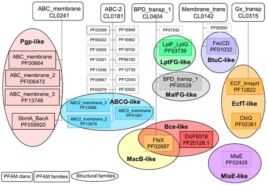 The BPD_transp_1 clan includes four families with diverse structures (Figure 2 and Figure S1). Three Pfam families include proteins with experimental structures belonging to different structural classes (MacB-, Bce-, LptFG-, and MalFG-like). Notably, the known Bce-like structures (PDB IDs: 7tcg and 7tch []) involve two transmembrane domains with MacB-like and Bce-like folds on a single polypeptide chain. The fourth family, DUF1430, is defined by a soluble domain. In these proteins, cytosolic domains likely prohibit the binding of NBDs to the TMDs, thus they may not be considered real ABC proteins.