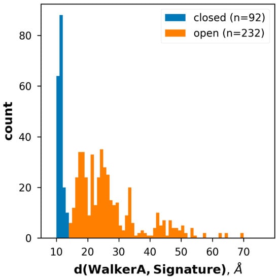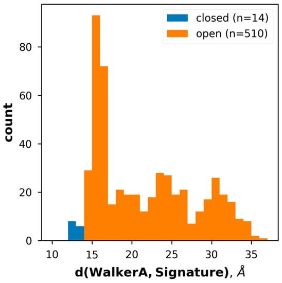 We have developed 3D vector-based measures, conftors, to describe the relative orientation of domains and highlight structural differences in ABC protein structures []. Since the inward- and outward-facing conformation correlates with the level of NBD association (Figure 1 and Figure S1), we defined |conftor(WA/SIG)|, the distance between the Walker A in one of the NBDs and the signature motif from the other NBD to classify the conformations (Figure 1). For this definition, two residues from the Walker A (GXXXXGKT) and the signature (LSGGQ) sequences were selected based on their spatial location. Since these Lys and Gly are located at helix ends and not in loops, noisy fluctuations in the distance between their Cα atoms were prevented. These positions were identified by aligning the query NBDs to a reference NBD (Pgp NBD1 from 6c0v) using the TM-align algorithm and not by simple sequence search, since there are many ABC proteins with degenerate, non-conserved ATP-binding sites (e.g., CFTR/ABCC7 possesses a degenerate signature motif [,]). The distribution of the distances between Walker A and signature calculated for all structures (Figure 3) indicated a cutoff value of 14 Å for distinguishing bottom-closed and bottom-open conformations. Indeed, visual inspection of structures with|conftor(WA/SIG)| = 14 ± 2 Å confirmed this value as a rational cutoff. We aimed to identify the source of very large NBD separation, thus we compared the distance values of X-ray and cryo-EM structures. Large NBD distances were observed in structures of both datasets (Figure S6).
