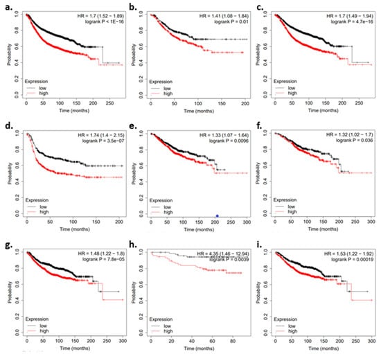 - Györffy, B.; Lanczky, A.; Eklund, A.C.; Denkert, C.; Budczies, J.; Li, Q.; Szallasi, Z. An online survival analysis tool to rapidly assess the effect of 22,277 genes on breast cancer prognosis using microarray data of 1,809 patients. Breast Cancer Res. Treat. 2010, 123, 725–731. [Google Scholar] [CrossRef] [PubMed]