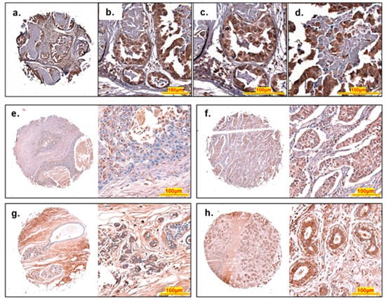 - Thorat, M.A.; Marchio, C.; Morimiya, A.; Savage, K.; Nakshatri, H.; Reis-Filho, J.S.; Badve, S. Forkhead box A1 expression in breast cancer is associated with luminal subtype and good prognosis. J. Clin. Pathol. 2008, 61, 327–332. [Google Scholar] [CrossRef] [PubMed]