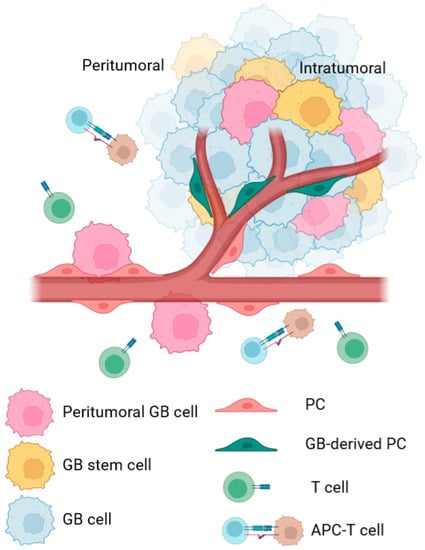 In recent years, GB environment and implicated cells and molecules have acquired a special interest. In particular, peritumoral PCs are an attractive target to generate new therapeutical approaches because they are located in small blood vessels of the brain parenchyma, where GB spreads and invades the perivascular space [,].