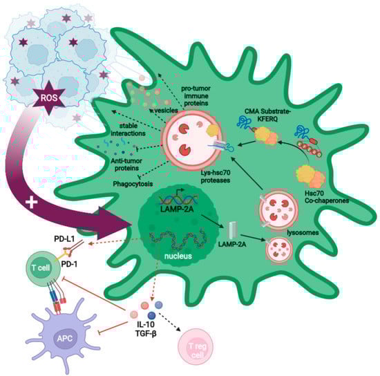 We have shown that GB interaction with PCs located in peritumoral areas is accompanied by a high expression of the CMA receptor LAMP-2A in both cells. In addition, our data demonstrated that GB cells alter the PC proteome through aberrant degradation of critical proteins by CMA, promoting tumor survival and growth. A transient ROS burst is produced in the PCs following physical interaction with the GB cell, leading to overexpression of LAMP-2A, the only limiting molecule for CMA activity (Figure 2). CMA is then aberrantly upregulated in PCs, consequently affecting the PC phenotype, which promotes stable cell-to-cell interactions that favor tumor cell proliferation, and which induces an immunosuppressive function that impairs anti-tumor immune responses [,].