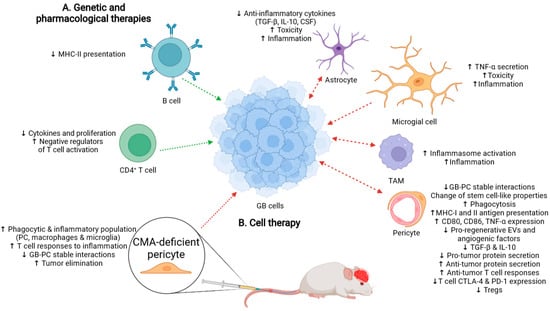 Possible immune responses after CMA inhibition therapies to prevent GB progression. In immune and brain-resident cells, CMA may be altered in different ways in response to GB, and its inhibition might favor tumor progression (green arrows) or promote anti-tumor activity (red arrows). Thus, (A) future gene and pharmacological therapies against CMA should take into account that cells of the adaptive immune response, such as CD4+ T cells and B cells, require CMA to develop their anti-tumor responses. CD4+ T cells need CMA for proper activation, including cytokine release and proliferation through degradation of negative regulators of T cell activation. B cells also need CMA for maintaining antigen presentation. However, inhibition of CMA in TME cells could have an anti-tumor effect. For instance, CMA decreases the inflammasome-mediated responses of TAMs and TNF-α secretion in microglial cells. Astrocytes also require CMA to acquire an anti-inflammatory phenotype dependent on physical contact with tumor cells. Thus, CMA inhibition would maintain an inflammatory phenotype that would aid tumor elimination. In addition, aberrant GB-induced CMA upregulation in PCs promotes cancer cell survival and progression through cell–cell stable interactions, contributing to the immunosuppressive peritumoral niche with the secretion of pro-tumoral proteins, angiogenesis promotion, and pro-tumoral macrophages recruitment. Therefore, CMA ablation in PCs would prevent GB–PC interaction, maintaining a pro-inflammatory phenotype, among other anti-tumor changes, that reduce tumor progression and promote tumor clearance. On the other hand, (B) CMA-deficient PCs can be used as an alternative therapy that can avoid possible side-effects of CMA inhibition in healthy and GB-conditioned cells. Modified PCs are able to inhibit GB tumor growth and induce tumor clearance preventing PC–GB interactions. They could no longer be modulated by GB cells and present a pro-inflammatory function that prevents tumor growth and helps tumor elimination by stimulation of the anti-tumor immune responses. This effect is partly due to the secretion of pro-tumor molecules (lumican, vitamin D, among others), increased phagocytosis ability, and antigen presentation. Hence, CMA-deficient PCs can stimulate TME cells, increasing phagocytic and inflammatory populations (macrophages, PCs, and microglia) and promoting T cell inflammatory responses.