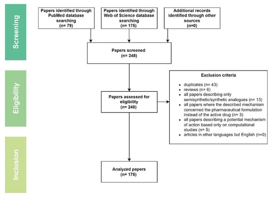 This review represents the continuation of our recently published paper regarding the mechanisms of action of several triterpenic acids of therapeutic value including asiatic, oleanolic, and ursolic acid []. The current paper depicted the most recent (last 5 years) studies on the MOA of betulinic acid, boswellic acid, glycyrrhetinic acid, madecassic acid, moronic acid, and pomolic acid in order to provide scientists with updated and accessible material on the topic that could set in motion future original studies. Two major databases were screened, i.e., PubMed (https://pubmed.ncbi.nlm.nih.gov, accessed on 4 February 2022) and Web of Science (WOS, www.webofscience.com, accessed on 4 February 2022), using as key search terms the main triterpenic acids’ names combined with “mechanism”; following the cross-examination of results by two experienced researchers, the following papers were included: (1) in vitro studies; (2) in vivo studies; and (3) studies describing the mechanism of action of natural triterpenic acids; and the following types of papers were eliminated: (1) duplicates; (2) reviews; (3) all papers describing only semisynthetic/synthetic analogues; (4) all papers where the described mechanism concerned the pharmaceutical formulation instead of the active drug; (5) all papers describing a potential mechanism of action based only on computational evaluation; (6) articles in other languages than English (Figure 1).