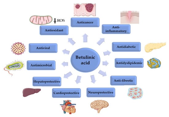 Biological activities of betulinic acid. Parts of the figure were drawn by using pictures from Servier Medical Art. Servier Medical Art by Servier is licensed under a Creative Commons Attribution 3.0 Unported License (https://creativecommons.org/licenses/by/3.0/; accessed on 2 August 2022).