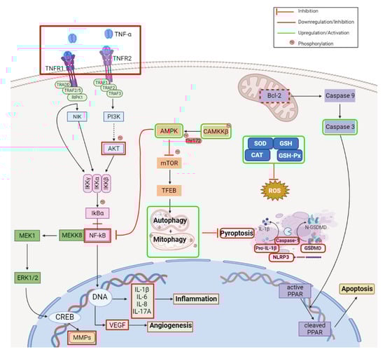 Inflammation may trigger pyroptosis, a cell death mechanism which has been previously associated only with infectious diseases; more recently, pyroptosis’s role has been extended to other pathologies, including cancer [], cardiovascular diseases [], and spinal cord injuries []. Wu et al. studied the underlying mechanism of BA in spinal cord injury in mice and identified several mechanisms that might activate each other to provide alleviation in spinal cord injuries. Through the activation of the AMPK-mTOR-TFEB pathway, BA activates autophagy and augments mitophagy, which further inhibit pyroptosis, as confirmed by the decrease in pyroptotic markers such as NLRP3, caspase-1, GSDMD, and IL-1β (Figure 5) [].