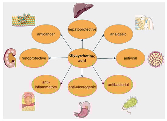 - Hussain, H.; Green, I.R.; Shamraiz, U.; Saleem, M.; Badshah, A.; Abbas, G.; Rehman, N.U.; Irshad, M. Therapeutic potential of glycyrrhetinic acids: A patent review (2010–2017). Expert Opin. Ther. Pat. 2018, 28, 383–398. [Google Scholar] [CrossRef]