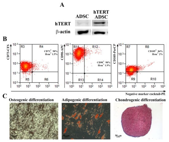 2.4. hTERT-Transduced ADSC Sub-Populations Maintain Their Immunophenotype and Their Multilineage Differentiation Capacity