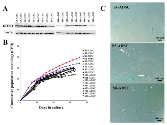 Analysis of hTERT expression, proliferation rates and senescence marker β-galactosidase of hTERT-transduced ADSC-derived sub-populations. (A) Expression of hTERT in 18 hTERT-transduced ADSC sub-populations as revealed by Western Blot technique. (B) Comparison of proliferation rates of hTERT ADSC-derived sub-populations. Note that two subpopulations (S1 and S8-ADSC) had high proliferation activity, while the rest of the tested cells stopped proliferating after 29–30 population doublings. (C) Senescence-associated β-galactosidase assay performed at passage #10 after transduction, showing the lack of enzyme activity in high-proliferative sub-populations S1 and S8-ADSC and a noticeable activity in sub-population S5-ADSC, which stopped proliferating after 30 population doublings (β-galactosidase positive cells are indicated with white arrows).