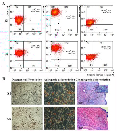 S1 and S8 sub-population were analyzed to assess whether these cells met the MSC definition requirements. Thus, as shown in Figure 4A, both sub-populations expressed CD73, CD90, and CD105 and were negative for hematopoietic markers. Interestingly, both had a higher expression for CD105 (90% for S1 and 97% for S8) than the parent ADSC or the heterogenous hTERT-transduced ADSC population, which were 86% and 84% CD105 positive, respectively.