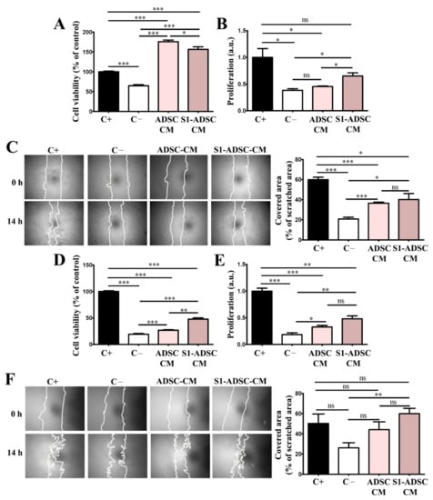 The time-dependent profile of the chemotactic migration of cultured EC in response to CM was assessed by an xCELLigence assay (Figure 6C). The results showed a strong chemoattractive effect both for S1-ADSC-CM and ADSC-CM. However, although both secretomes had an initial chemoattractive effect stronger than the positive control (serum) at early times (2–3 h), without a statistical significance difference between the two, the cellular index of cells migrating in the presence of S1-ADSC-CM measured at 4 h was about 1.3 times lower in comparison to those incubated with ADSC-CM (2.2 ± 0.3 versus 1.6 ± 0.1, respectively). In addition, the scratch test showed that S1-ADSC-CM had a strong impact on EC migration (Figure 6D). Thus, it induced a coverage of 43.8 ± 8.9% of the scratched area in comparison to 35.2 ± 0.7% for ADSC-CM (not statistically relevant) and 19.7 ± 3.6% for negative control.